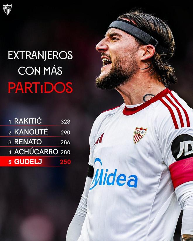 北京时间3月9日,西甲第27轮,塞维利亚坐镇主场迎战巴列卡诺,最终塞维利亚1-1战平巴列卡诺,本场比赛,塞维利亚队长古德利代表球队首发出场并打满全场。据塞维利亚官方统计,这场比赛是古德利代表球队出场的第250次,他也超越阿尔维斯(249场)成为塞维利亚队史出场次数第五多的外籍球员。